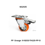 Polyurethane (PU) orange wheel with pressed steel swivel castor for light to medium duty applications, providing smooth rotation, wear resistance, and reliable mobility.