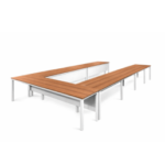 The Heritage Boxy is a sleek, modern rectangular meeting table featuring a warm wood-finish top paired with crisp white legs for a contemporary office aesthetic.